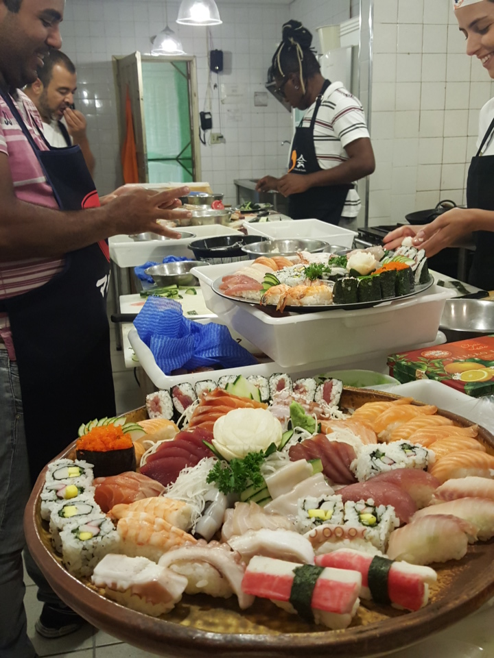 Ingredientes: Pepino, nabo, manga, algas, salmão (inteiro), 1 peixe para cada 2 alunos.
