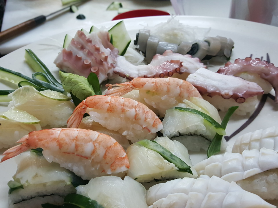 Ingredientes: Pepino, nabo, manga, algas, peixe branco (inteiro), cortes e kani.