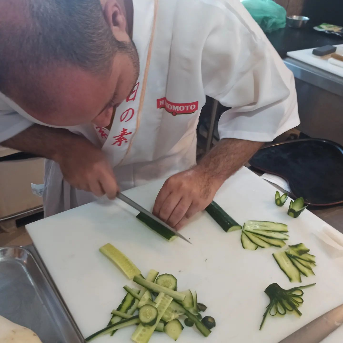 Do nigiri cronometrado ao gunkan de ovas (masago), passando por oshizushi, treine cortes e montagem com atum (akami), linguado, camarão, polvo, lula, serra/carapau, e algas nobres. Decorações com pepino, cenoura e nabo, completam a apresentação profissional.